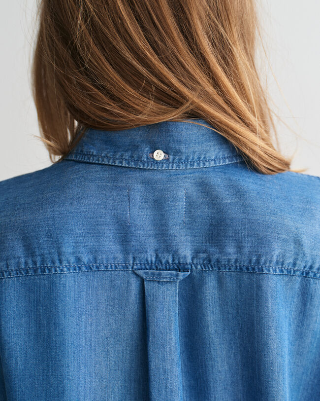 Esta camisa de corte holgado, confeccionada en 100% lyocell con un tono añil, combina con prácticamente todo. Cuenta con cuello francés, bajo curvado, un bolsillo en el pecho con el logotipo bordado y nuestros inconfundibles fuelle y trabilla en la espalda. Esta prenda está diseñada con corte holgado. Si deseas un corte más ajustado, te recomendamos escoger una talla menos.