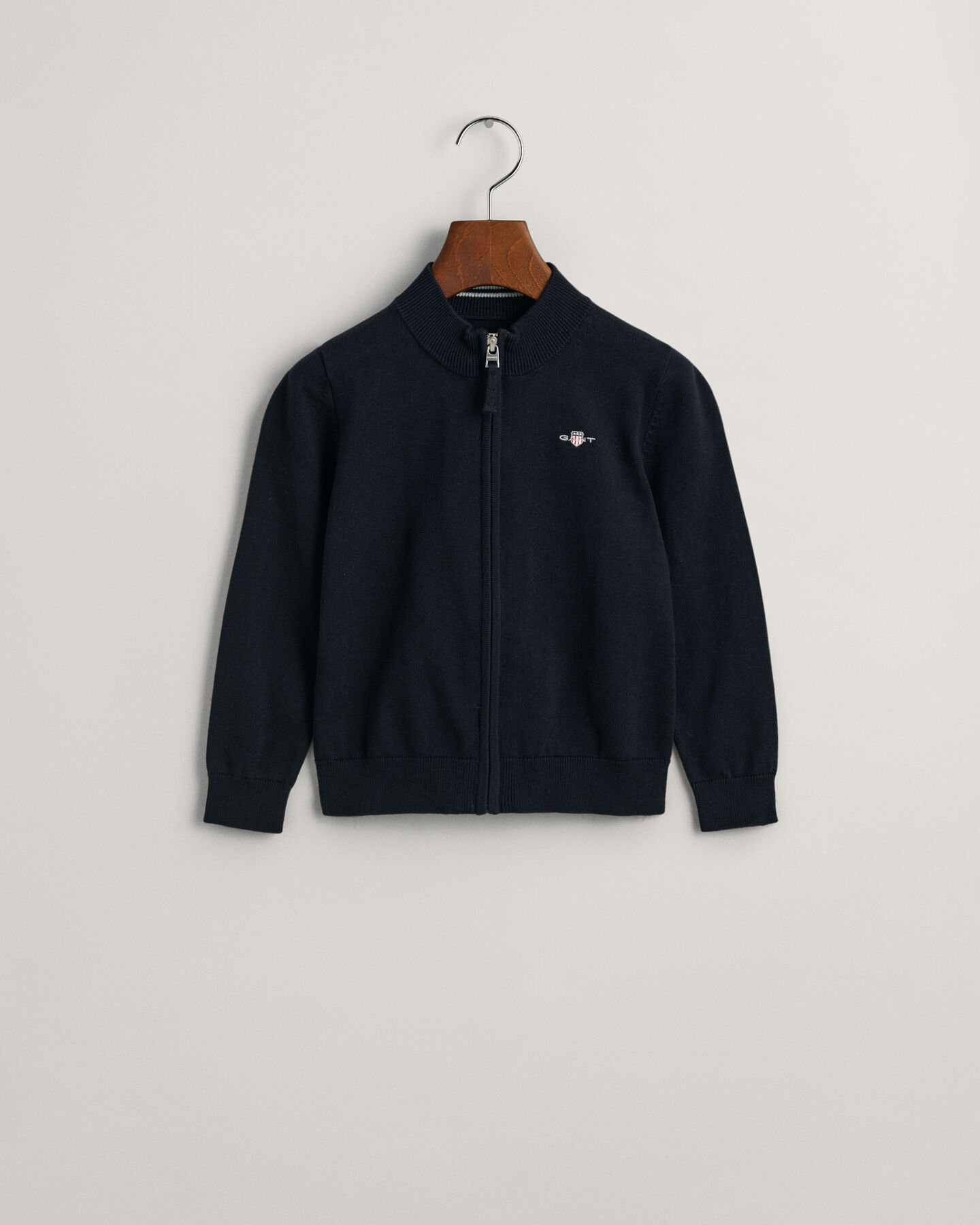 Este cárdigan de algodón infantil para el día a día presenta un corte normal unisex. Luce cremallera en la parte delantera, cuello, bajo y puños acanalados, y una insignia de pequeñas dimensiones bordada en el pecho.