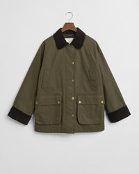 Esta cazadora encerada es una prenda de abrigo imprescindible de la temporada. Se ha diseñado con corte holgado y largo justo por debajo de la cadera, y cuenta con manga raglán ancha, cuello de camisa clásico con pana en contraste y bolsillos en el pecho y con solapa en la parte delantera. Presenta un revestimiento encerado en seco con un acabado que repele el agua, diseño con acolchado ligero, cremallera metálica bidireccional y botones de presión metálicos. Esta prenda está diseñada con corte holgado. Si deseas un corte más ajustado, te recomendamos escoger una talla menos. Se ha sometido a un tratamiento Durable Water Repellent (DWR) que hace que la prenda sea resistente al agua ante las suaves lluvias de entretiempo. Si te pilla un chaparrón inesperado, sigue al pie de la letra las instrucciones de cuidado para restaurar su rendimiento y prolongar la vida útil de la prenda. Cuenta con plumón con capacidad de relleno de 650 y un aislamiento ligero.