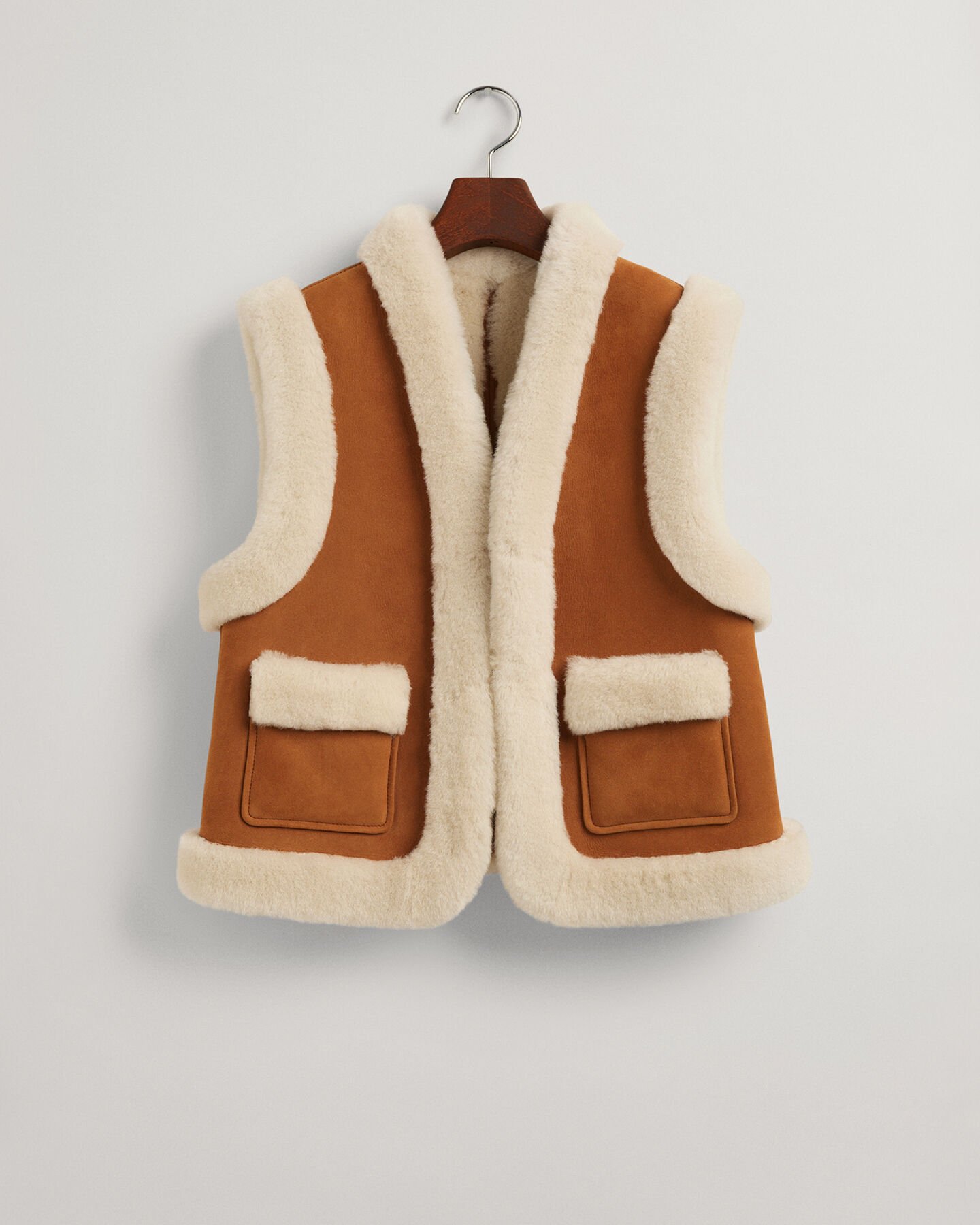 Este chaleco de largo acortado, inspirado en los setenta, es la prenda perfecta para ponerse encima de vestidos y jerséis. Está confeccionado en piel de cordero con exterior de ante y con borreguito en el interior y en los detalles exteriores. Cuenta con bolsillos de parche y cierre de corchetes en la parte delantera.