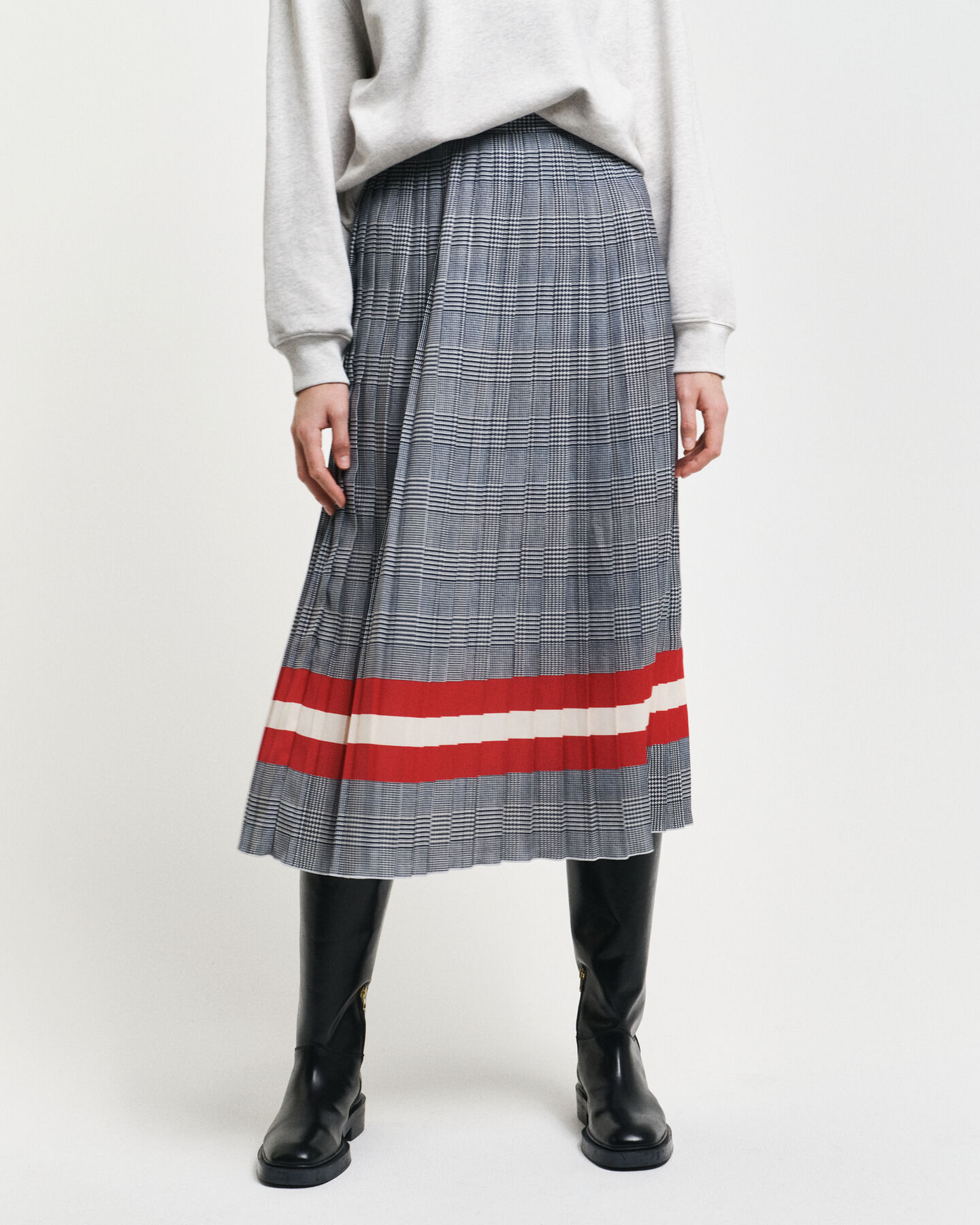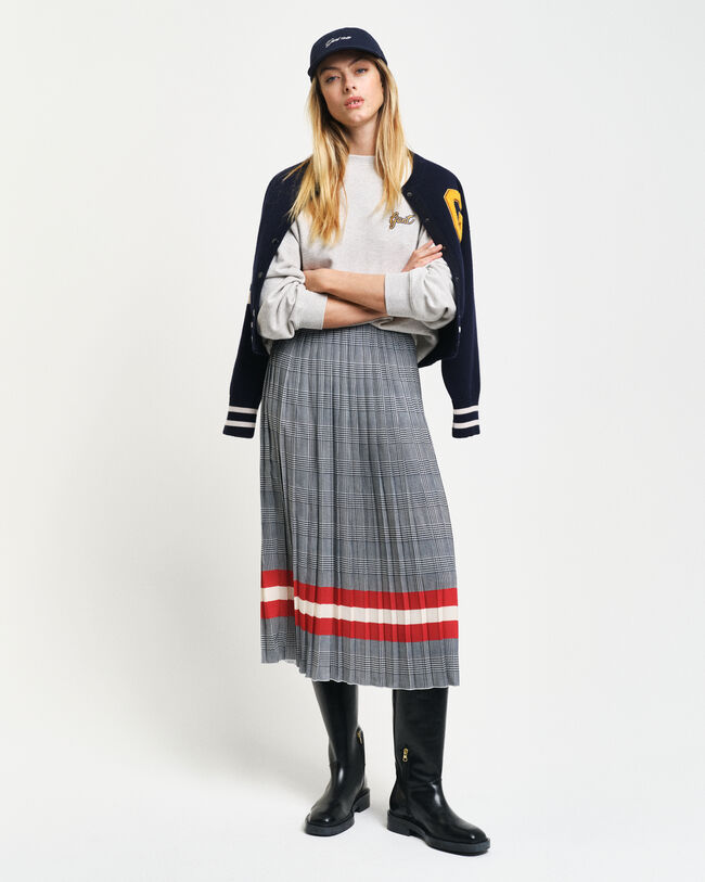 Esta falda plisada, confeccionada en 100% poliéster reciclado, combina un estampado de cuadros de temporada con rayas en contraste. Se ha diseñado con corte normal, talle medio y largo midi hasta la mitad de la pantorrilla. Cuenta con cremallera lateral oculta y cierre de corchete en la cintura.