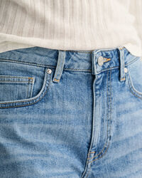 Estos pantalones cortos vaqueros, confeccionados en un cómodo algodón elástico, incorporan un lavado añil medio que les confiere expresividad y carácter. El corte es normal, con cintura de tiro medio, entallado en la cadera y recto en la pernera. También presentan largo hasta medio muslo, botones de pie con la marca y una etiqueta de piel en la parte posterior de la cinturilla.