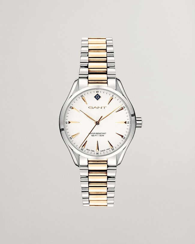 Los relojes GANT son más que un complemento. Hemos creado una colección para mujer elaborada con materiales de lujo que rinde homenaje a nuestra historia como emblema del estilo American Sportswear. El reloj Sharon está elaborado en acero inoxidable con chapado iónico en oro y cristal mineral. Cuenta con tres manecillas.