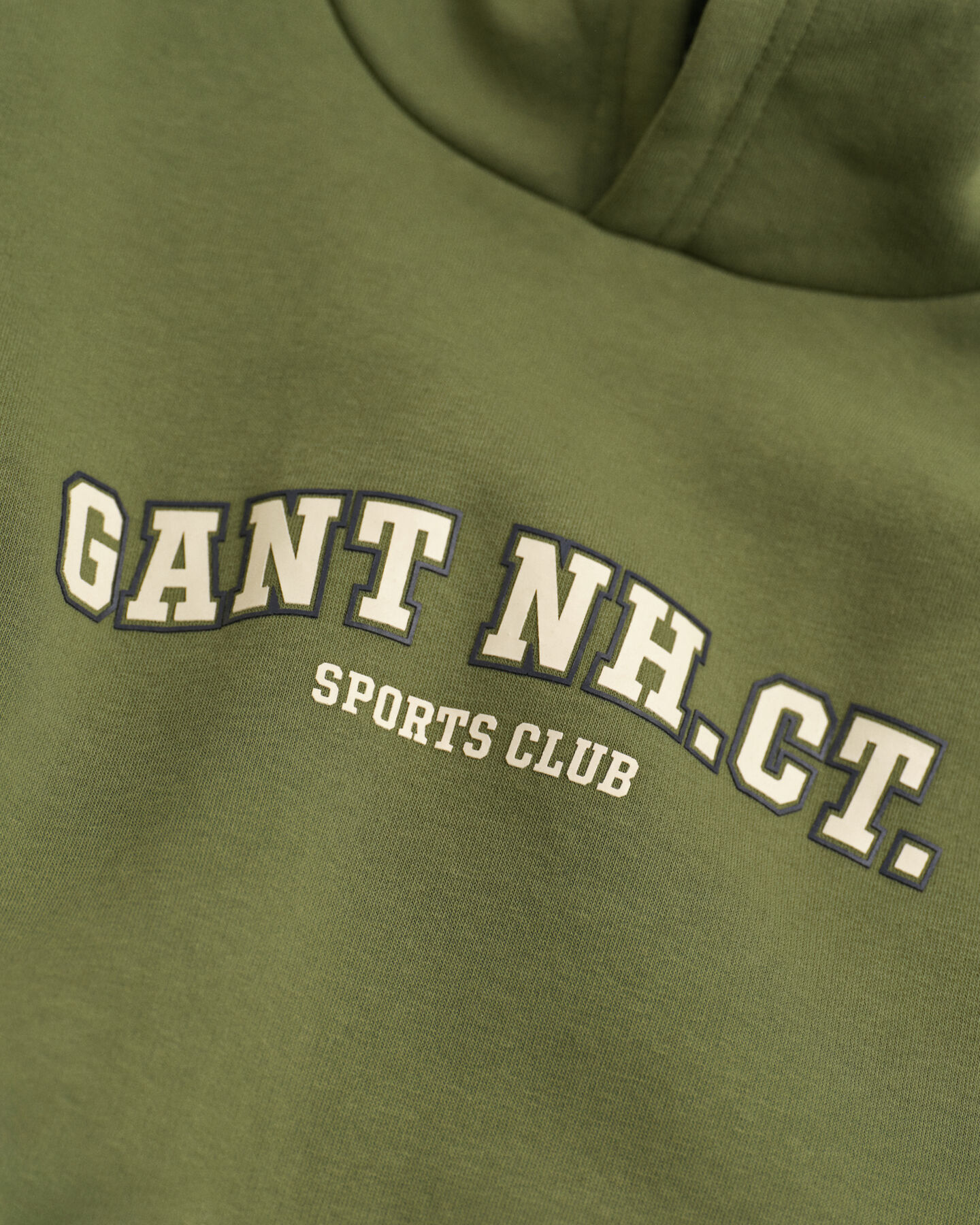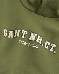 Esta sudadera con capucha para chica y chico, con corte holgado unisex, es una prenda básica que podrán usar a diario. Está confeccionada en una suave mezcla de algodón y cuenta con manga larga, capucha y un bolsillo de parche delantero. El modelo también incluye acabados de canalé y un diseño GANT de temporada estampado en el pecho.